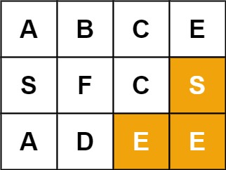 Input: board = [["A","B","C","E"],["S","F","C","S"],["A","D","E","E"]], word = "ABCCED" Output: trueInput: board = [["A","B","C","E"],["S","F","C","S"],["A","D","E","E"]], word = "SEE" Output: trueInput: board = [["A","B","C","E"],["S","F","C","S"],["A","D","E","E"]], word = "ABCB" Output: false